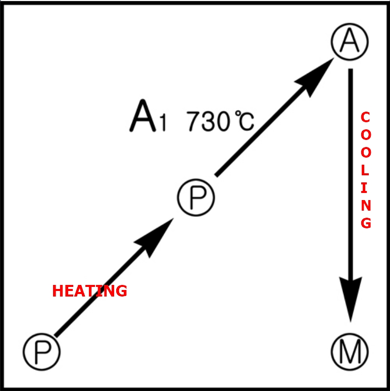 Put simply, quenching is the process of transforming pearlite (P) into austenite (A) through heating, and then into martensite (M) through rapid cooling.