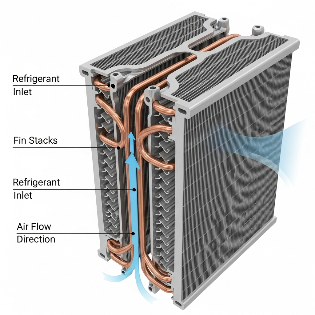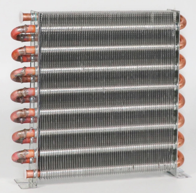 The core section consists of tubes and densely packed cooling fins.